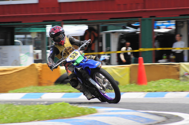 前日からのどしゃ降りの雨が早朝まで降っていましたがなんとか晴れ間が見えて朝一のサーキットの路面状況は所々にウエットパッチが残るもののほぼドライの状況に奇跡的に回復しましたがダートコースは水溜りが残る状態でキャンセルされました。