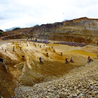 ようやく森を抜けると、次はガレ場の登りです。雨が次第に強くなり、焦りまくっている所に、トドメの渋滞ポイント。岩盤一本ラインに、20台位のマシン。濡れた岩はタイヤのグリップを奪い、その上「ノーヘルプゾーン」で、誰も全く登れません。それでも抜かなければ。私はラインを外し、岩の斜面を登ろうとトライ。しかし、ヘルメット程の岩もろとも、土砂崩れのように下まで滑落してしまいます。いつのまにか、雨は土砂降りに。鉱山の一角で、焦りのトライが続きます。そんな時です、スタッフから残念な告知がありました。降雨が激しくなり、レースは30分切り上げて中止するとのこと。悔しいですが、私の挑戦はこのガレ場で終わりました。