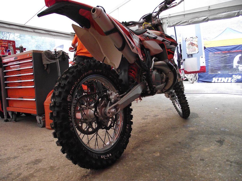 今回使用したマシンは、KTM300XC-W。このエルツベルグでは、半数がこのマシンをチョイスしているだろうと言われている、このレースでの大人気車種です。2st300㏄が何故良いのか、それはこの特殊なコースに理由があります。鉱山の残土を押し固めた路面が多い為、ザクザクのヒルクライムが多く、100メートル級のヒルクライムではかなりパワーを喰われている感じです。又、助走のないヒルクライム、頂上付近が切り立ったの登り等では瞬発力が必要ですし、ガレ場の登りでは排気量の大きいトルクが必要です。そう言った点が、このマシンが人気となる理由でしょう。しかも私のモデルは、まだ発売されていない2013モデル。今回KTMサポートを受けることができた関係で、贅沢なマシンに乗ることができました。乗った完走は…もちろん最高!ただ、決勝で装着するリヤタイヤ「VE33」は、他のタイヤよりもブロックが大きく高い為、ザクザクの路面でこの排気量の負荷をかけた場合、消耗が激しいとも懸念されました。